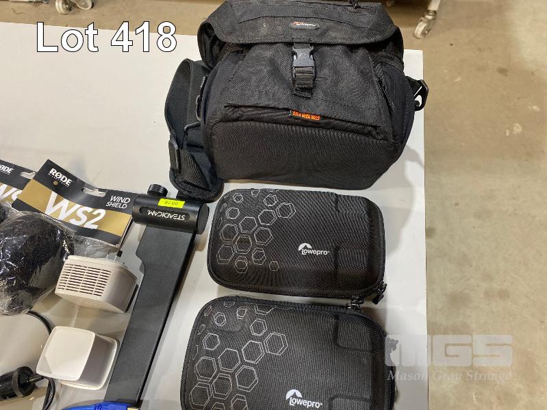 QTY ASST SPARE CAMERA PARTS, ACCESSORIES INC MEMORY CARD CASES, LOWPRO CAMERA CASES, CARD READER, RODE WIND SHIELDS, HDMI TO USB CONVERTER, NETGEAR Wi-Fi RANGE EXTENDER
