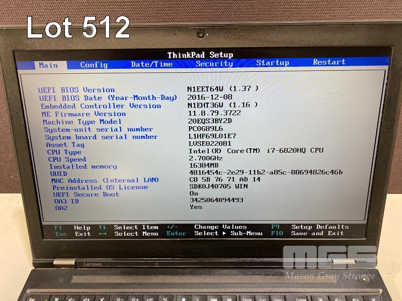 LAPTOP, LENOVO THINKPAD P50 MOBILE WORKSTATION (20EQS3BY2D), CORE i7 6820HQ (6TH GEN) @ 2.7GHz, 16GB DDR4 RAM, 512GB SSD, 15.6" WIDESCREEN (1920x1080), 4GB NVIDIA QUADRO M2000M VIDEO, Wi-Fi, BLUETOOTH, WINDOWS 10 PRO INSTALLED & POWER SUPPLY (NOTE: MARKS ON SCREEN) S/N:PC0G89L6