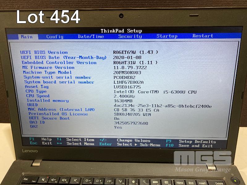 LAPTOP, LENOVO THINKPAD T460 (20FMS0KV03), CORE i5 6300U (6TH GEN) @ 2.4GHz, 16GB DDR3 RAM, 500GB SSD, 14" WIDESCREEN (1366x768), INTEL HD VIDEO, Wi-Fi, BLUETOOTH, WINDOWS 10 PRO INSTALLED & POWER SUPPLY (NOTE: WHITE SPOT SCREEN BLEMISHES, DAMAGE TO BATTERY LATCHES) S/N:PC0EHE82