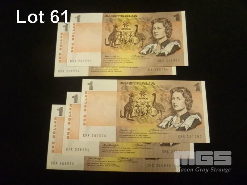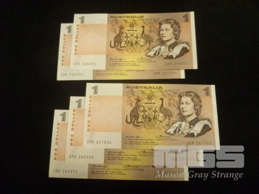 1976 5 x $1.00 NOTES 2 x CONSECUTIVE RUNS, "CENTRE THREAD" KNIGHTS WHEELER UNC