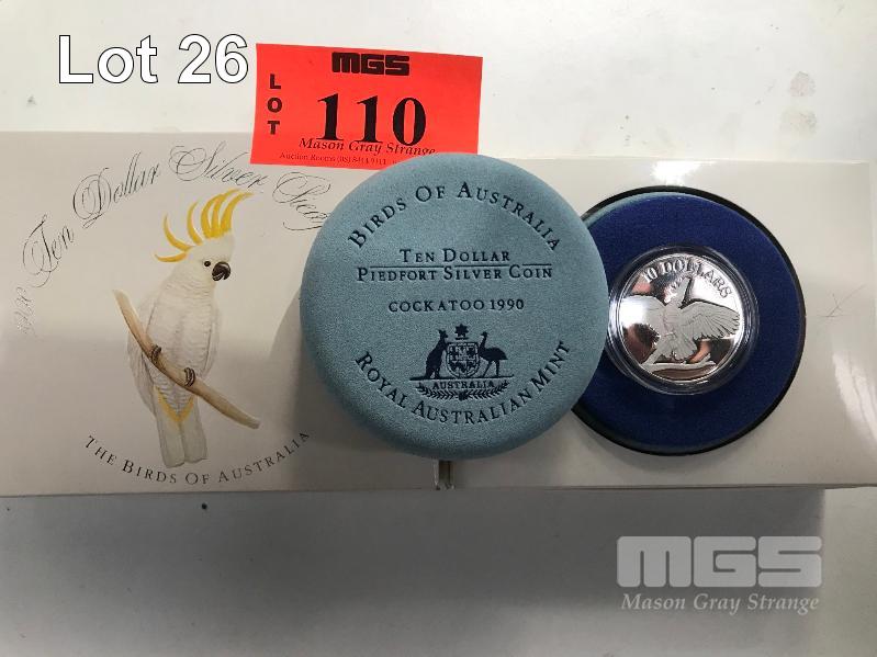 2 X 10 DOLLAR COINS, 1988, 1990 COCKATOO