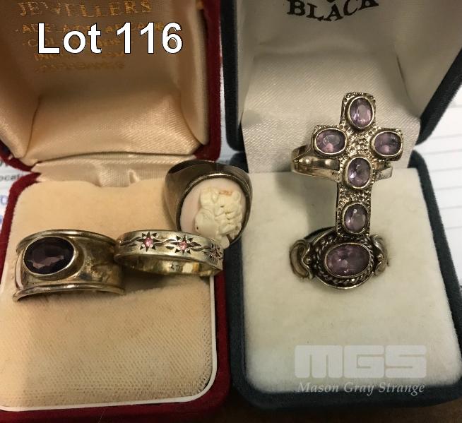 5 X STERLING SILVER RINGS, 4 X SET WITH AMATHYST, 1 X CAMEO 28.5 GMS