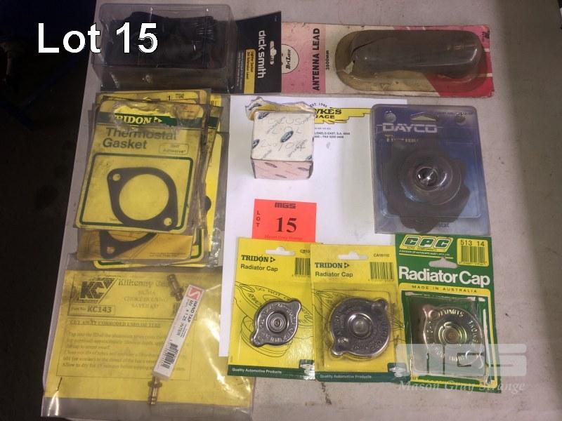 ASSORTED THERMOSTAT GASKETS, SIGMA CHOKE HOUSING SAVER KIT, ASSORTED RADIATOR CAPS etc.
