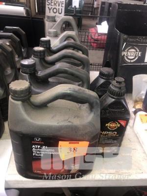 8 x PART BOTTLES, HONDA/FUCHS/PENRITE TRANS FLUID, PLUS POWER STEERING FLUID