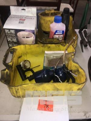 ASSORTED FUNNELS, TYRE REPAIR, OIL CANS & COOLANT
