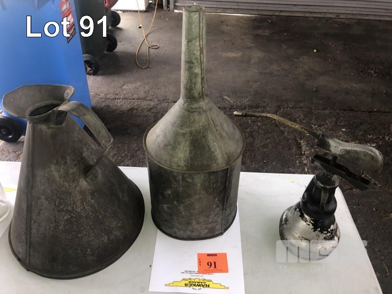 ANTIQUE TIN POURER, FUNNEL, GREASE GUN