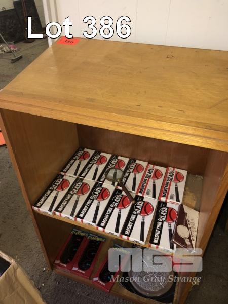 2 TIER TIMBER SHELF & CONTENTS, MAGNIFYING GLASSES