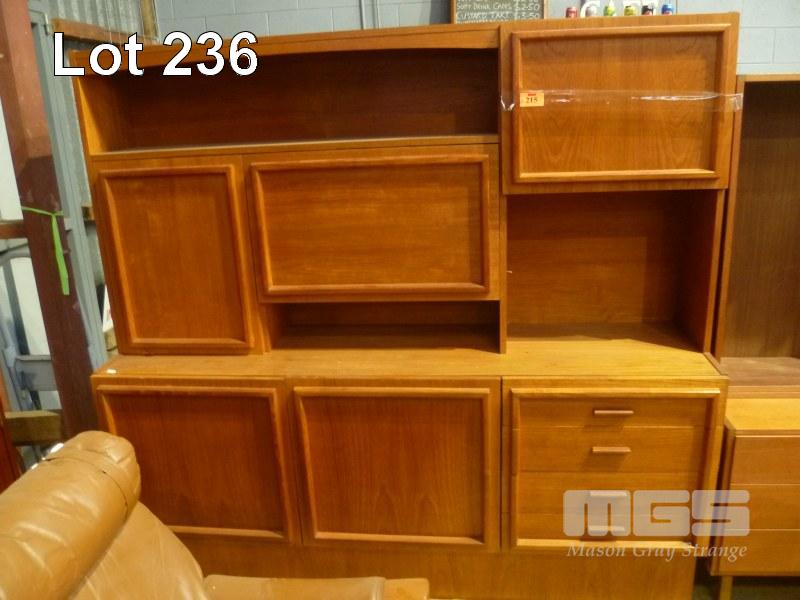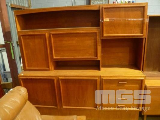 MACROB FURNITURE MID CENTURY TEAK WALL/COCKTAIL CABINET, 3 DOOR ABOVE STORAGE & 2 DOOR, 3 DRAWER UNDER STORAGE