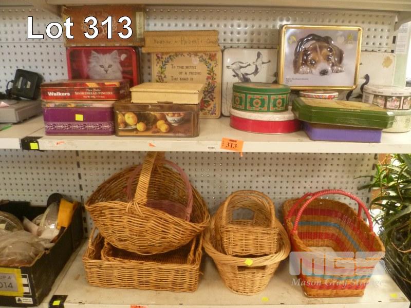 ASSORTED COLLECTABLE TINS & WICKER BASKETS, 2 x SHELVES