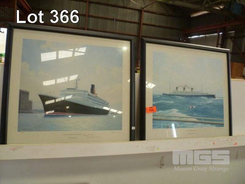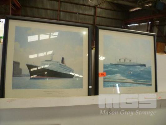 STEPHEN J CARD NAUTICAL SHIP PRINTS, SIGNED R.M.S QUEEN MARY LIMITED EDITION, 118/450, R.M.S QUEEN ELIZABETH 2 LIMITED EDITION, 113/450 SIGNED BY CAPTAIN ALSO CAPT KEITH STANLEY, 60 x 64cm EACH