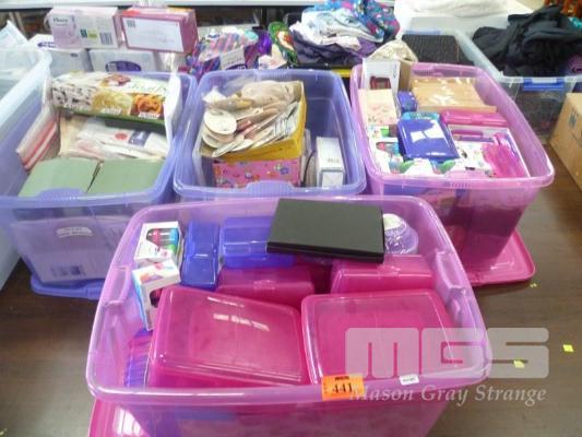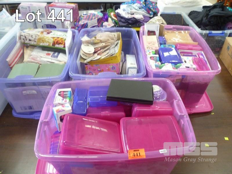 ASSORTED PLASTIC KITCHEN CONTAINERS, LIGHTING, SEWING, ETC, 4 x TUBS