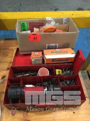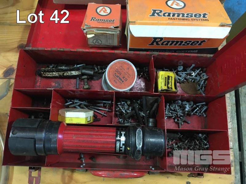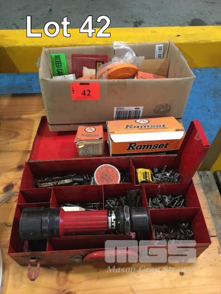 HILTI EXPLOSIVE FASTENER FIXING TOOL, TYPE: DX100 IN TOOLBOX WITH ASSORTED HILTI & RAMSET CONCRETE STUDS, ETC