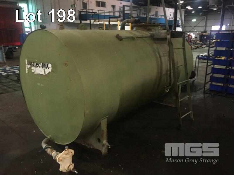 STEEL TANK, CYLINDRICAL, 5300 LITRE CAPACITY HORIZONTALLY MOUNTED ON SUPPORTS 1500mm DIAMETER x 3050 mm (L) TOP LIFTING LUGS, END MOUNT SIGHT LEVEL TUBE SIDE MOUNT ACCESS LADDER (BOLT ON) TO TOP HATCH 2 x BOTTOM OUTLETS WITH VALVES, 3 x TOP MOUNT INLETS & BREATHER PIPE (WAS USED FOR OIL STORAGE) S/N:O