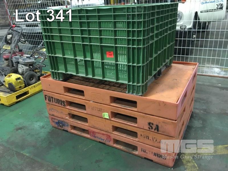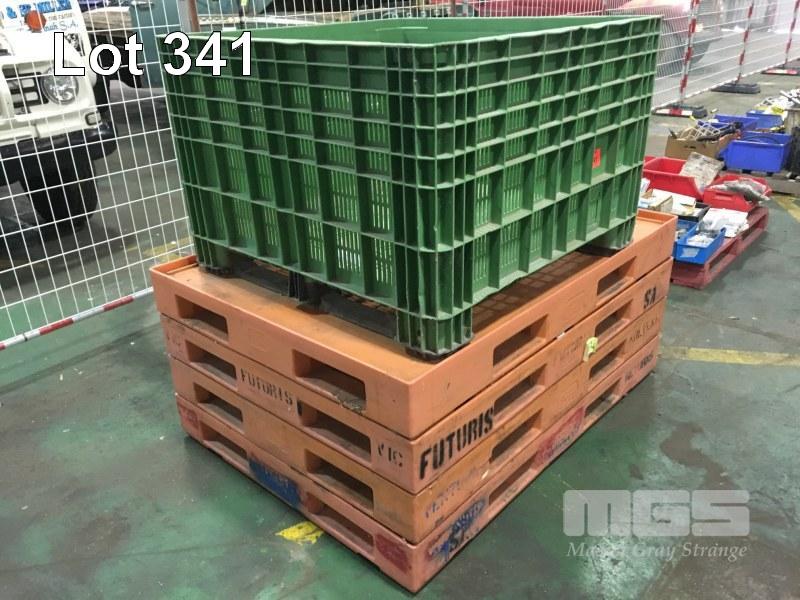 4 x PLASTIC PALLETS, EX HOLDENS, 1160 x 1550mm & 1 x GREEN PLASTIC CRATE, 1150 x 1150 x 750mm (H)