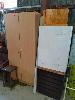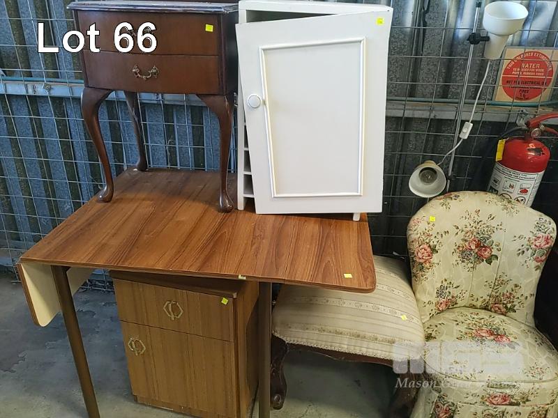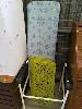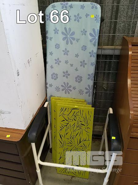 VARIOUS ITEMS OF FURNITURE INCLUDING 2-DOOR STORAGE CUPBOARD, SIDE TABLES, DRESSING CHAIR, OTTOMAN STOOL, FOLDING TABLE, BLIND, BOOK STAND, IRONING BOARD, DECOR PANELS, WALKING FRAME ETC
