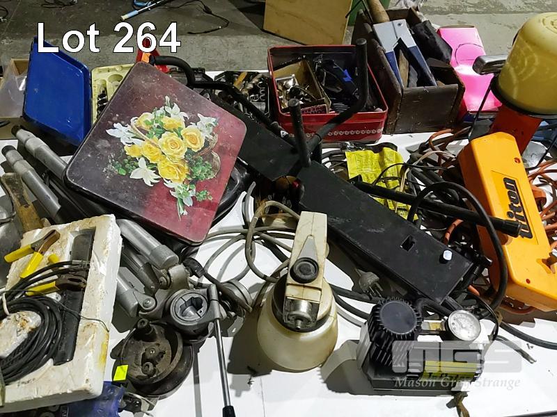 COLLECTION OF TOOLS AND OTHER WORKSHOP ITEMS INCLUDING VINTAGE ELECTRIC DRILLS, PAINT GUNS, AIR COMPRESSORS, SOCKET SETS, TILE CUTTER, BATTERY DRILLS ETC ALSO VINTAGE HOME BARBER KIT, HAIR CLIPPERS AND MORE