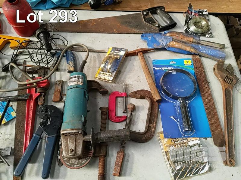 BOX OF ASSORTED OLD/NEW TOOLS & HARDWARE INCLUDING MAKITA 100MM DISC GRINDER, PLIERS, NIPS & SNIPS, SAWS, G-CLAMPS, CRIMPING TOOL, PIPE WRENCH AND MUTCH MORE