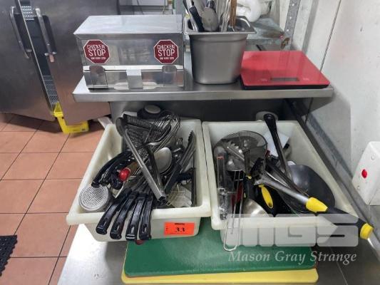 QTY OF COOKING UTENSILS TONGS, SCRAPERS, SPOONS, LADLES, SCALES, CUTTING BOARDS, ETC.
