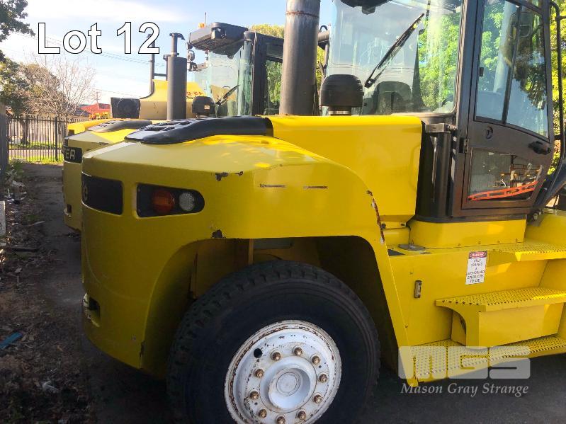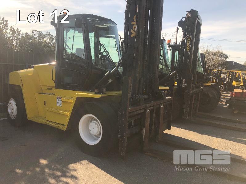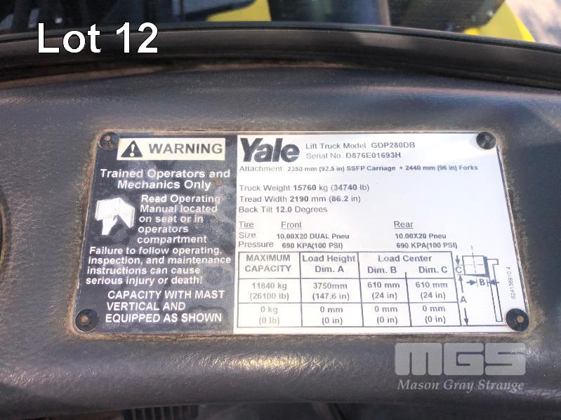 FORKLIFT, YALE, 12T MOD: GDP280DB S/NO: D876E01693H HOURS: 3,966 showing MAX LOAD:11,840kg @ 600mm LC MAX HEIGHT: 3,750mm 2 STAGE MAST BLADE POSITION 2440mm BLADES PNEUMATIC TYRES ENGINE: CUMMINS 6 CYLINDER TURBO DIESEL P/N: 1921776 S/NO: 34242391 E/C: 2930910 ESN: 21968025 ENCLOSED CAB A/C SEAT BELT, LIGHTS, FRONT/REAR WIPERS MIRRORS FIRE EXTINGUISHER