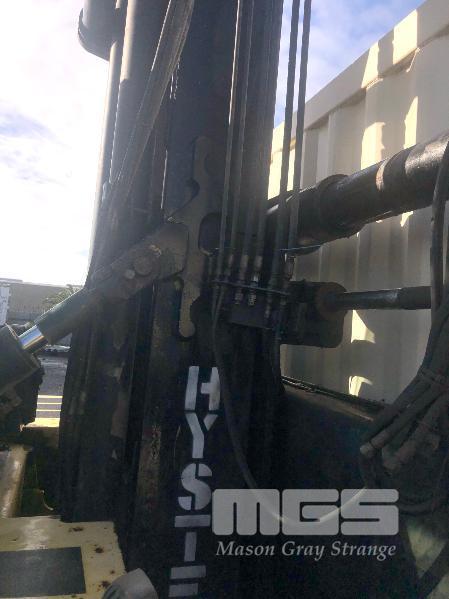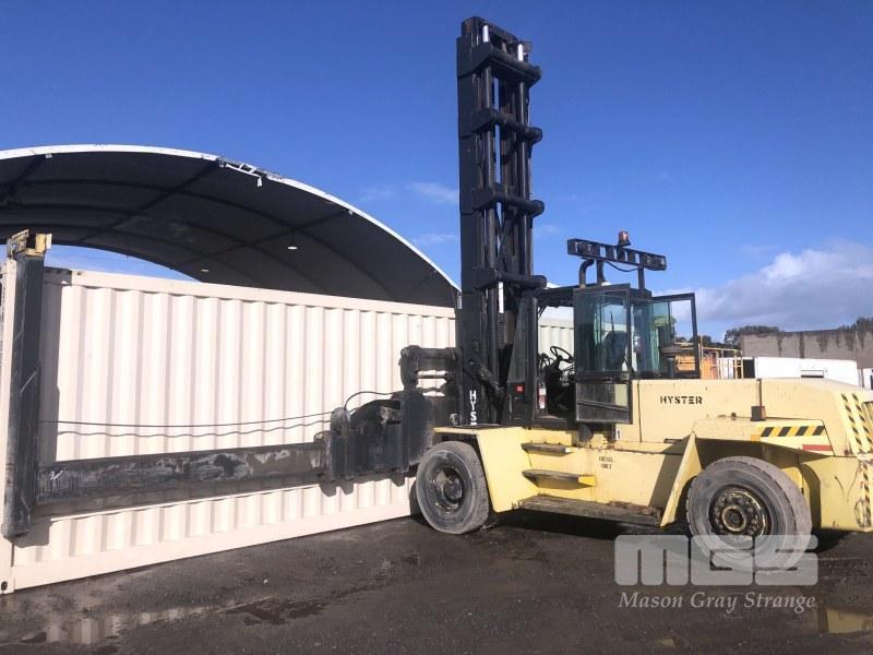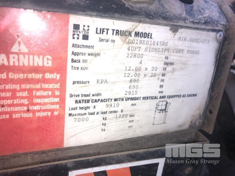 HYSTER XL16 FORKLIFT MOD: H16.00XL-EC4 FITTED WITH 40' SIDE LIFT CONTAINER FRAME TELESCOPIC, LOAD HEIGHT: 9910mm PERKINS 6 CYLINDER DIESEL ENGINE HOURS: 03095 SHOWING ENCLOSED CAB, AUTO TRANS, AIR TYRES, A/C S/NO: D019E01645RS MAX LOAD 7,000kg @ 1220mm CENTRES SOLD IN SITU (LOCATED AT WINGFIELD, INSPECT BY APPT JOHN FUSS 0412 694 852)