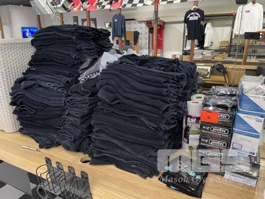HUGE QUANTITY BLACK TOWELS, DISPOSABLE GLOVES & FACE MASKS