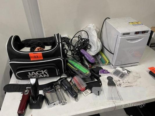 BARBERS PACK, TOWEL WARMER, TRIMMERS, BRUSHES, COMBS, CLIPPERS, ETC