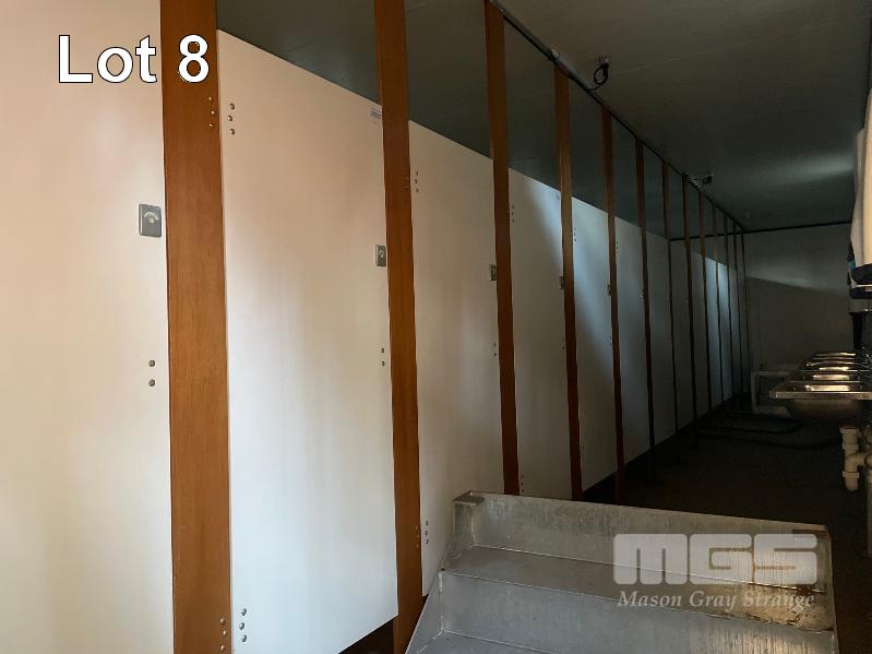 ABLUTION BLOCK 1: TRANSPORTABLE ABLUTION BLOCK 12 x 3m (FEMALE), 2 x ACCESS DOORS, 12 x CUBICLES & 6 x HAND BASINS, GALVANISED ACCESS STAIRS WITH HAND RAILS, GREEN COLOURBOND ALL WASTEWATER IS CONNECTED VIA UNDERFLOOR PLUMBING TO A SINGLE SEWER OUTLET (SOLD IN SITU, LOCATED AT KILBURN, INSPECTION ONLY VIA AN APPOINTMENT WITH MGS, CONTACT JOHN OR ANDREW)
