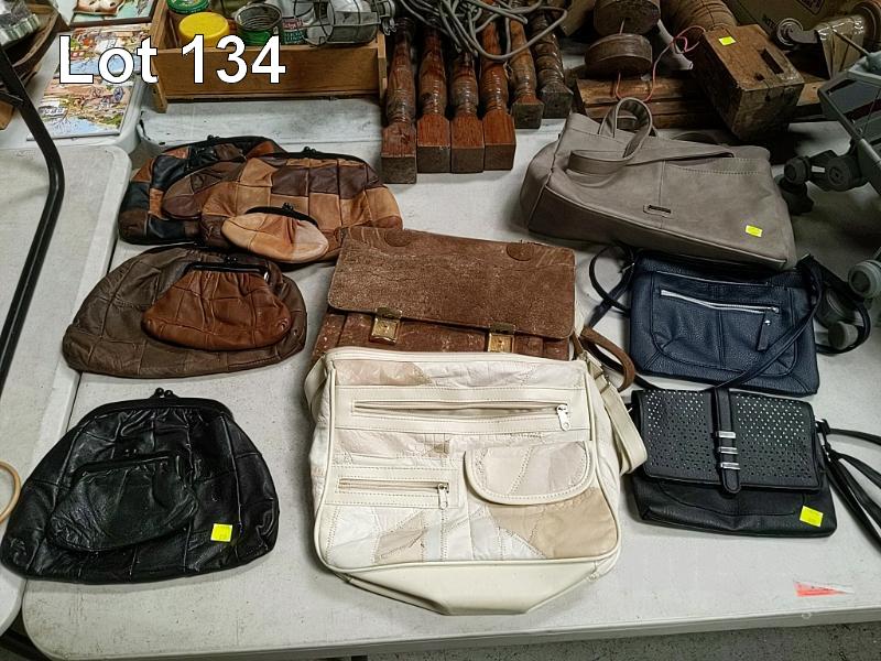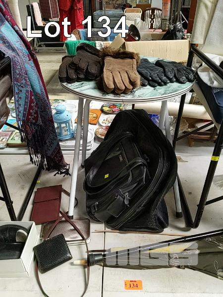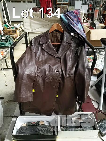 COLLECTION OF LADIES CLOTHING, HANDBAGS, PURSES, SHOES, UMBRELLAS, FOLDING CHAIRS ETC. INCLUDES LEATHER JACKET, GLOVES, FUR HATS AND MORE