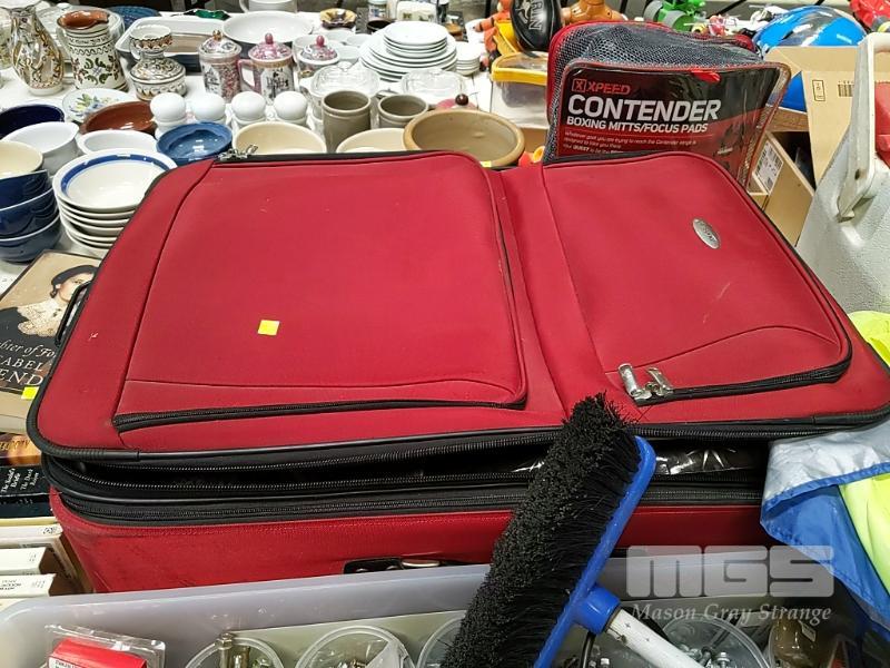 ASSORTED ITEMS INCLUDING SAMSONITE SUITCASE, QUANTITY OF WRAPPING PAPER, COLEMAN ESKY, BEACH SHELTER, INFLATABLE MATTRESS, HOME HARDWARE SUPPLIES, QUANTITY OF EXTENSION CORDS & POWER BOARDS, VINTAGE BLACK AND DECKER POWER DRILL AND MORE (1 x TABLE)