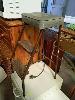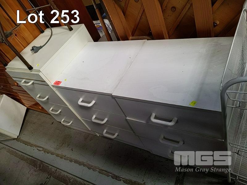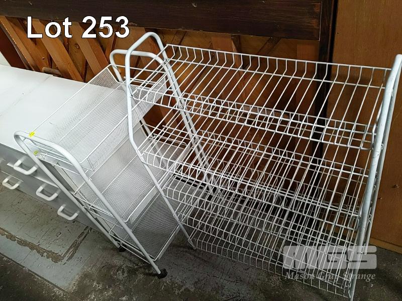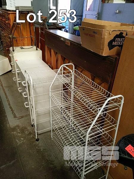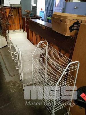 2 x 3-DRAWER BEDSIDE TABLES, 4-DRAWER BEDSIDE TABLE, 3-TIER MOBILE RACK, 5-TIER WIRE RACK AND VINTAGE STEP-STOOL.