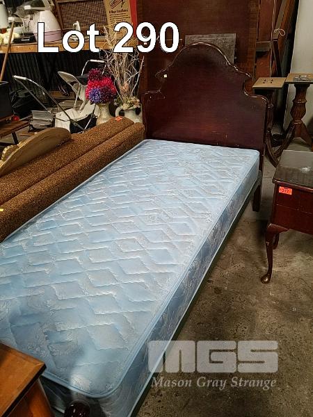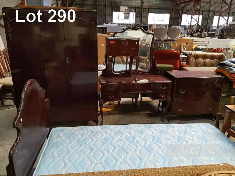 VINTAGE BEDROOM SUITE BY "MATHIAS & CO ADELAIDE" IN QUEEN ANNE STYLE COMPRISING SINGLE BED AND MATTRESS, 2-DOOR CUPBOARD, 2-DRAWER BEDSIDE TABLE, 5-DRAWER DRESSING TABLE WITH MIRROR AND 4-DRAWER CHEST