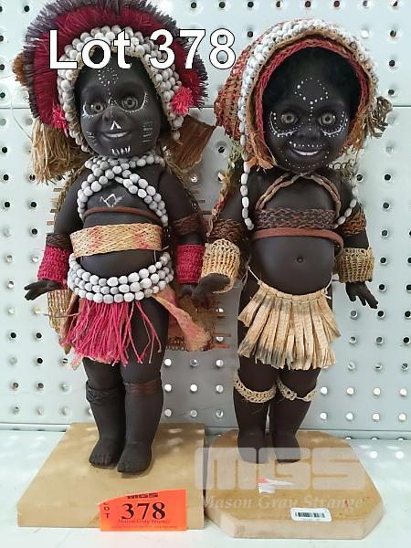 SET 2 RUBBER TRADITIONAL DRESS DOLLS ON STANDS, PAINTED FACES, 34cm (H)