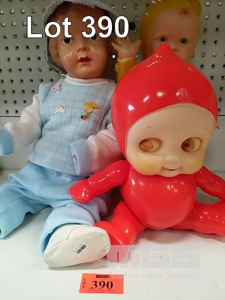 3 x CELLULOID DOLLS INC LITTLE BOY DOLL IN BLUE/WHITE OUTFIT, 56cm (H), RED BABY DOLL, LARGE HEAD, 35cm (H) & YELLOW BABY DOLL, 40cm (H)