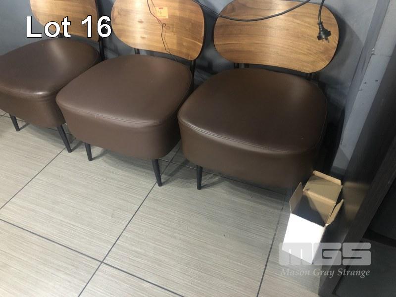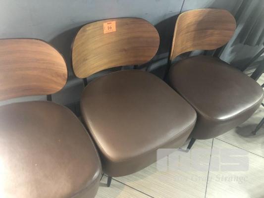 6 x CUSTOM DINING CHAIRS, BROWN VINYL BASE, CURVED TIMBER BACK