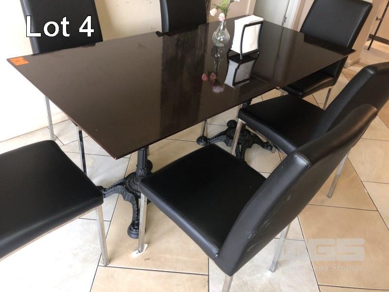 2 x DARK FINISH TIMBER TOP TABLES, 800 x 800mm, SINGLE PEDESTAL CAST ORNATE BASES & 6 x BLACK VINYL & CHROME CHAIRS