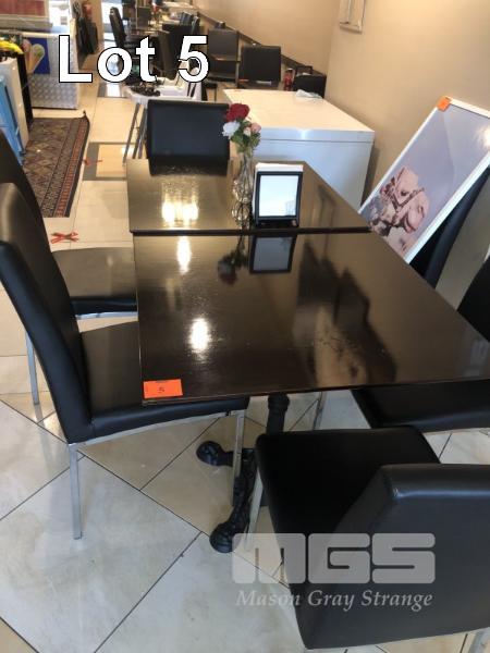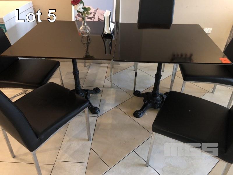 2 x DARK FINISH TIMBER TOP TABLES, 800 x 800mm, SINGLE PEDESTAL CAST ORNATE BASES & 6 x BLACK VINYL & CHROME CHAIRS