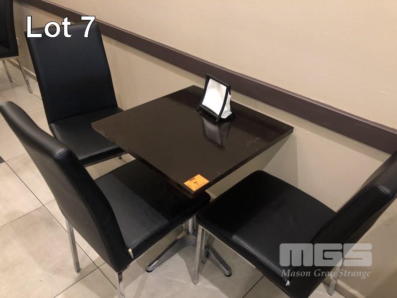 2 x DARK FINISH TIMBER TOP TABLES, 600 x 600mm, SINGLE PEDESTAL ALLOY BASES & 3 x BLACK VINYL & CHROME CHAIRS