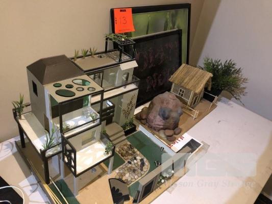 2 x DIORAMAS, HOUSE & YARDS & 2 x ORNAMENTAL PLANTS