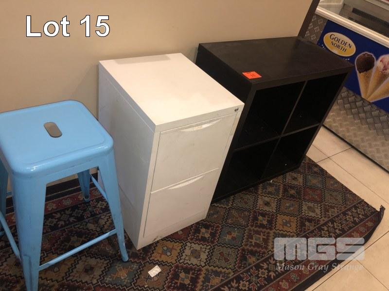 LOWLINE TIMBER SHELF UNIT, 2 TIER, STEEL 2 DRAWER FILING CABINET, BLUE STEEL STOOL & 2 x FLOOR RUGS