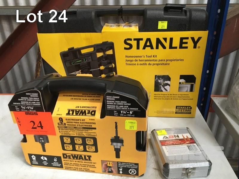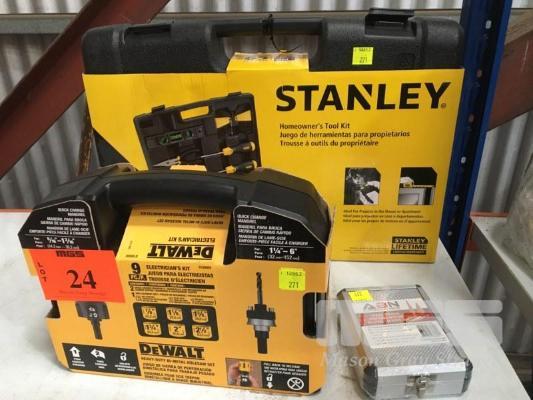 STANLEY HOME TOOL KIT, 65 PIECE IN CARRY CASE, DEWALT HOLE SAW SET, 9 PIECE & 3 PIECE STEP DRILL SET IN CARRY CASE