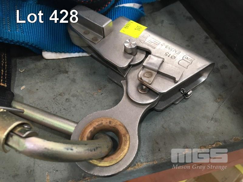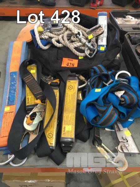 FALL ARREST/CLIMBING EQUIPMENT INC 4 POINT SAFETY HARNESS, 5 x LANYARD SHOCK ABSORBERS, 3 x FALL ARREST/ROPE SELF CLIMBING DEVICES, SPAN SET ATTACHMENT STRAP & SAFETY ROPE