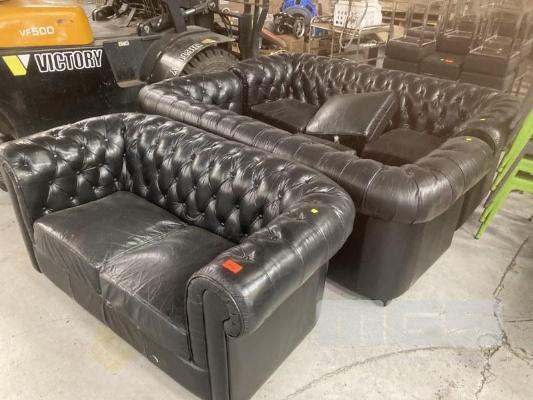 2 x 3 SEATER & 1 x 2 SEATER SOFAS, DEEP BUTTONED, BLACK VINYL