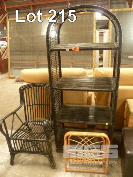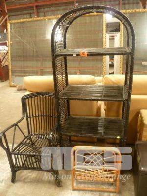 BLACK PAINTED, ARCHED, WICKER SHELF UNIT, BLACK PAINTED CANE ARM CHAIR & CANE MAGAZINE RACK