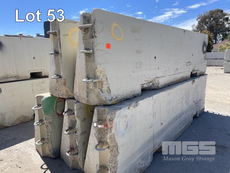 5 x RACE TRACK CONCRETE BARRIERS COMPRISING 5 x CORNER BARRIERS 4000 x 1000mm (NOTE: ALL HAVE MINOR EDGE DAMAGE) (TO MAKE THEM STRAIGHT, A 50mm EDGE NEEDS TO BE CUT OFF)