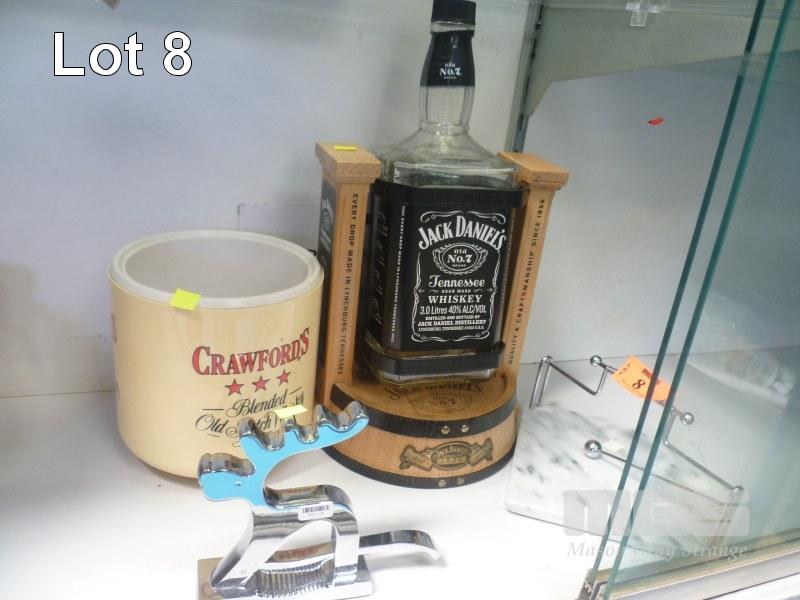 JACK DANIELS SWING ARM DECANTER, (EMPTY), CRAWFORDS ICE BUCKET, CHROME REINDEER NUTCRACKER & SERVIETTE HOLDER