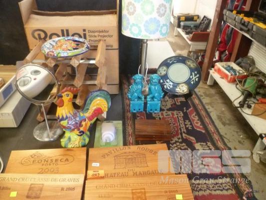 TIMBER PLAQUES, WINE RACK, ROLLEI SLIDE PROJECTOR, CERAMIC ORNAMENTS, ETC