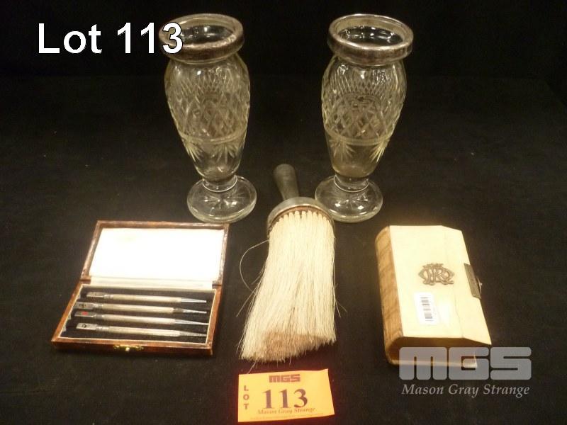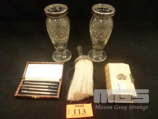 HALLMARKED SILVERWARE INC PRAYER BOOK (COVER CRACKED), SILVER CATCH, PAIR VASES, SILVER RIMS, HAIRDRESSER BRUSH, SILVER HANDLE & SILVER PENCIL SET