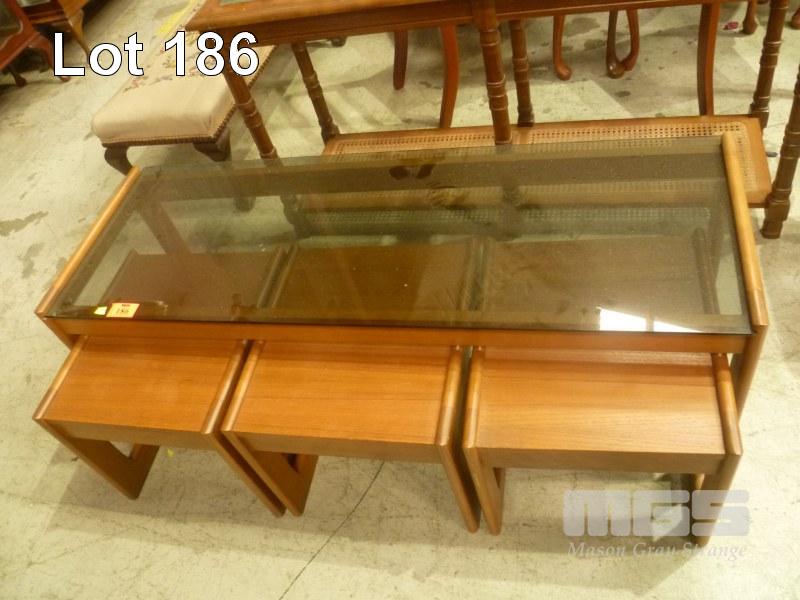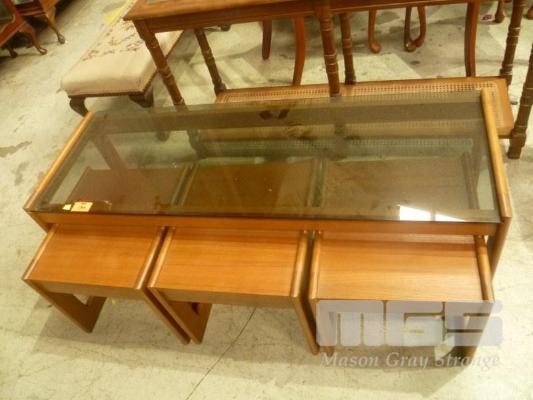 TEAK, RECTANGULAR COFFE TABLE, SMOKEY GLASS TOP WITH SET OF 3 MATCHING SIDE TABLES