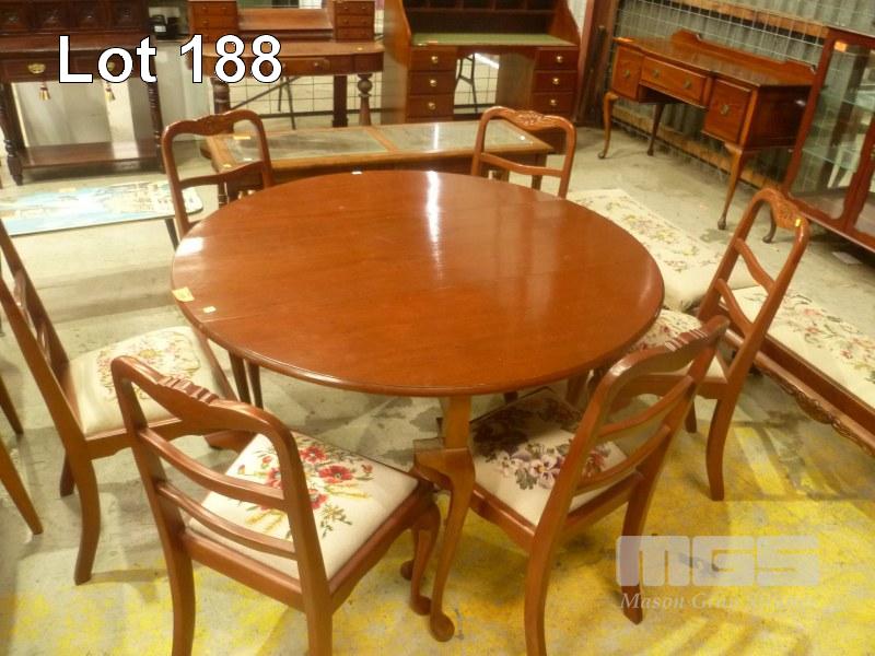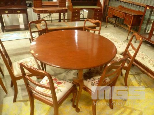 MAHOGANY 7 PIECE DINING SUITE INC ROUND DROP SIDE, LEG GATE DINING TABLE & 6 x CHAIRS, TAPESTRY FABRIC