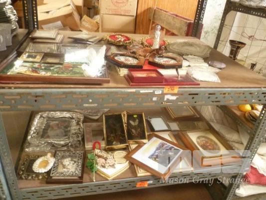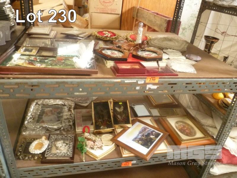 ASSORTED FRAMED PRINTS, ETC, 2 x SHELVES